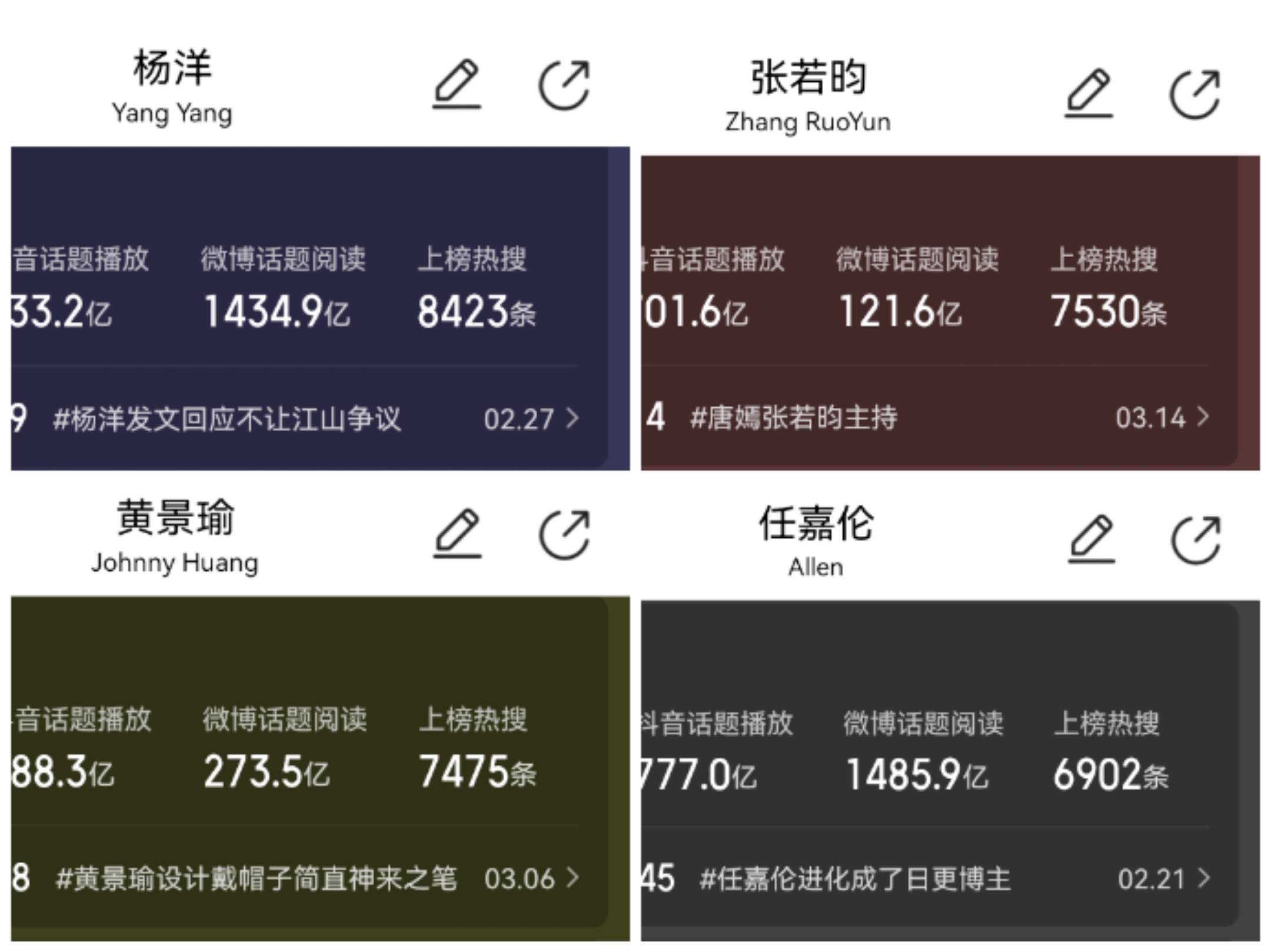 杨洋、张若昀、黄景瑜、任嘉伦四个热搜差不多,任嘉伦还是垫底的!
