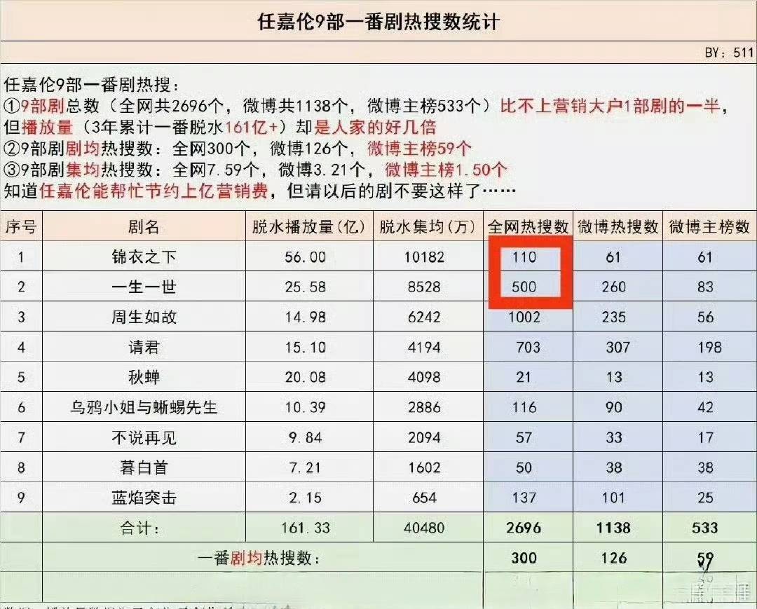 任嘉伦《锦衣之下》大爆以后,欢瑞过亿营销费都甩锅给他,实际上锦衣热搜仅仅110个,9部剧热搜加起来才2696个,还不如前同事一部剧的热搜多。