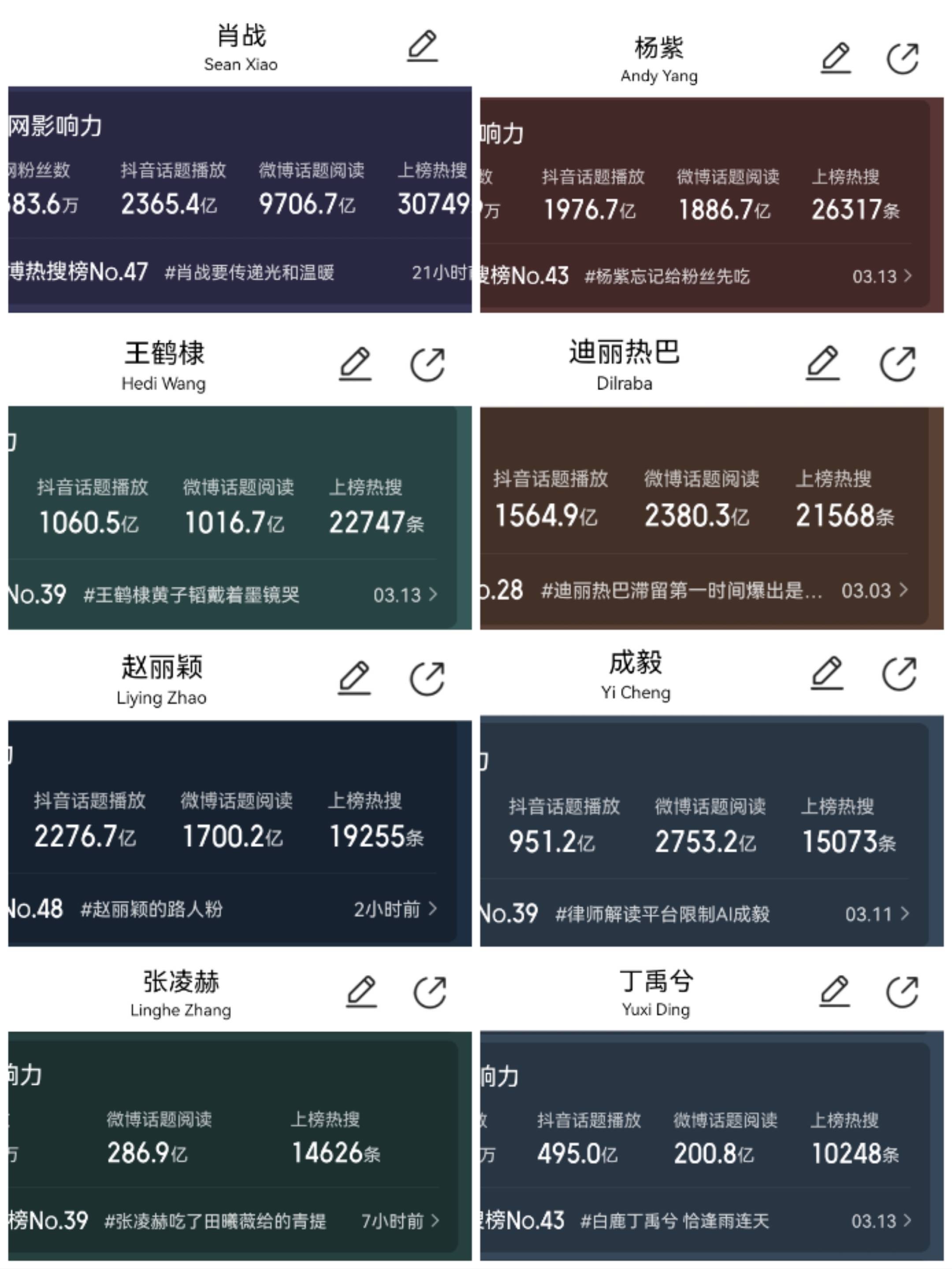 个人热搜第一是顶流肖战,这个不算意外,女明星杨紫、赵丽颖、迪丽热巴也都2万+。